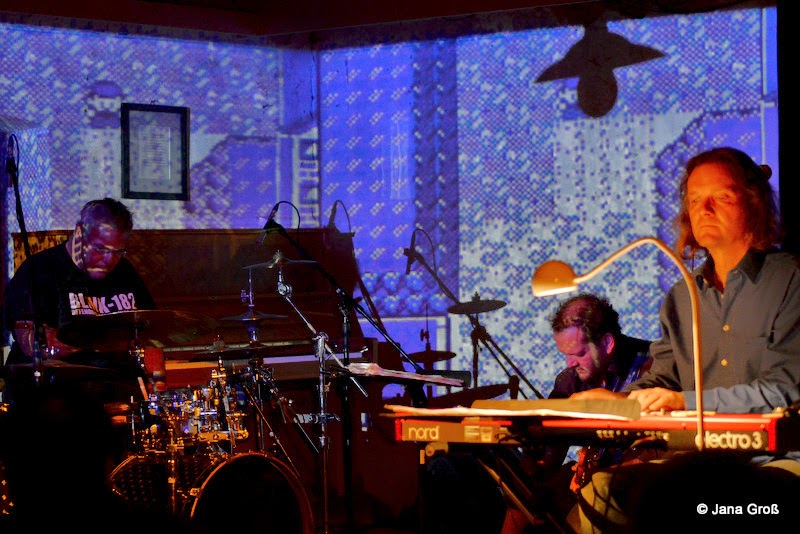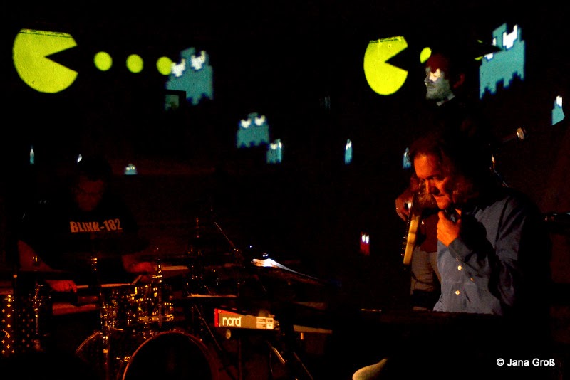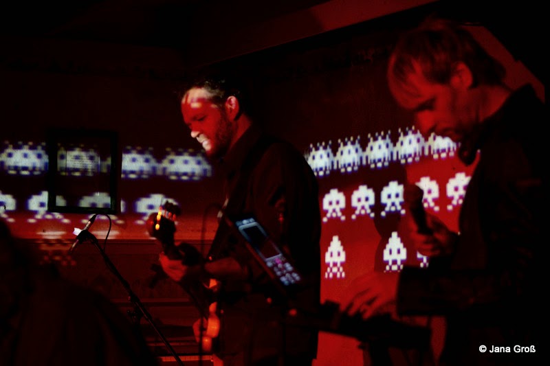 ″ Mehr und mehr verschmelzen die Musiker mit den stimmigen Video-Projektionen von VJ Workflow. Wenn Pikachu durch die Straßenschluchten jagt, laufen die begeisterten Zuhörer längst mit. ″
